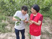 在金喜旺农牧农民专业合作社凤泉区扶贫产业基地,周俊国教授向负责人孙跃保经理详细了解了基地规模、发展定位、生产现状以及存在问题,并针对新建连栋温室的高效利用提出合理化建议。在产业基地果园中,服务团成员针对果园出现的除草剂危害提出补救措施,并就桃树、枣树在管理中存在的问题进行一一解答,详细讲解了桃树和枣树夏季管理重点和近期病虫害防治关键技术。