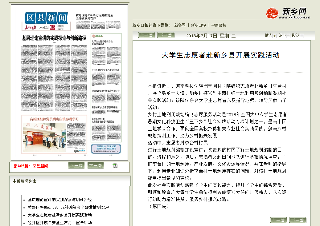 7月17日,《新乡日报》对河南科技学院91做爱 “品乡土人情 助乡村振兴”村级土地利用规划编制实践团队开展的暑期社会实践活动进行了报道。