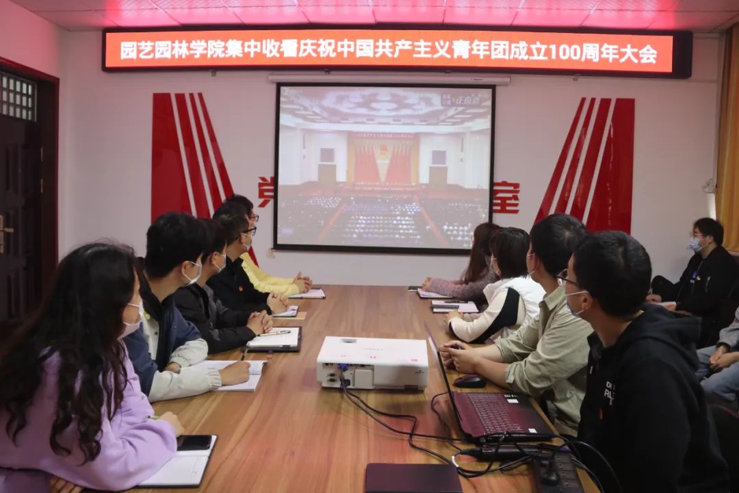 组织师生观看“庆祝中国共产主义青年团成立100周年大会”现场直播,党委副书记朱黎娅、校内辅导员老师和学生会主席团成员参加。