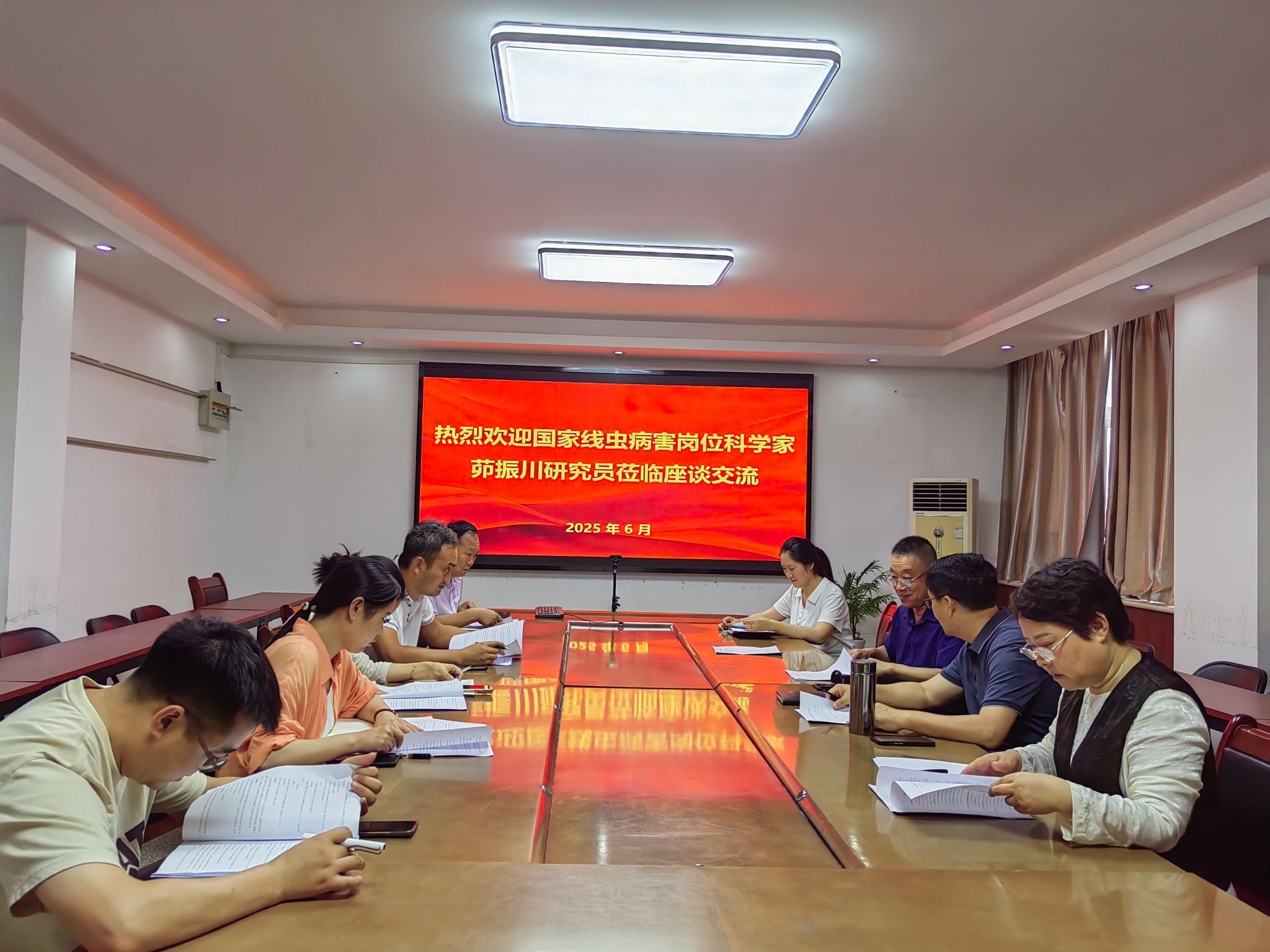 设施蔬菜创新栽培团队与国家大宗蔬菜产业技术体系线虫病害防控岗位科学家、中国农业科学院蔬菜花卉研究所茆振川研究员开展专项对接,共同在新乡市龙华种植农民专业合作社组织实施土传病害绿色防控新技术示范工作。团队李新峥教授、陈碧华教授、王新法副教授、吴春珲博士、潘飞飞博士、张淮霞博士、石亚芳博士、寇刚等老师参与座谈。