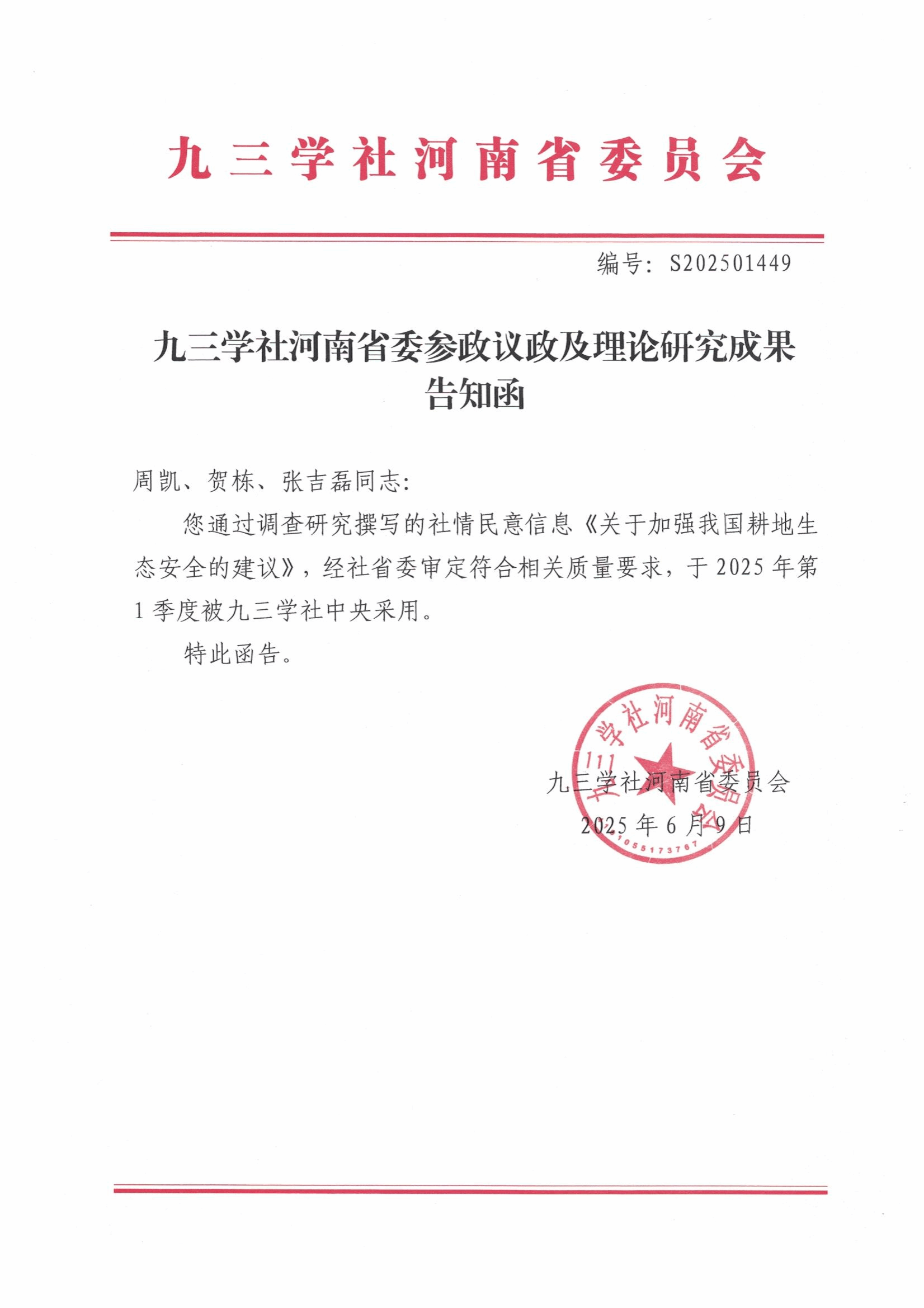 近日,九三学社新乡市委会召开参政议政工作推进会,对上半年的参政议政工作进行了总结。我院周凯副教授(校九三学社委员会副主委)和贺栋老师等撰写的社情民意信息《关于加强我国耕地生态安全的建议》被九三学社中央采用。