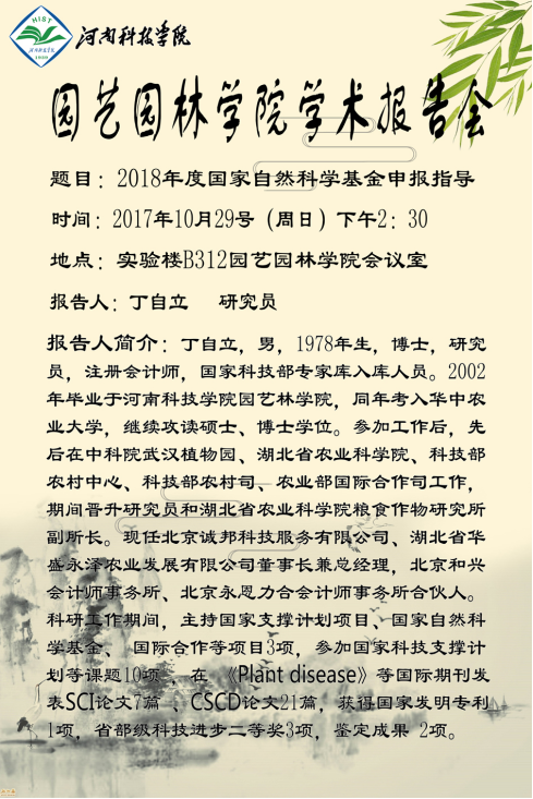 报告人简介:丁自立,男,1978年生,博士,研究员,注册会计师,科技部专家库入库人员。2002年毕业于河南科技学院园艺林学院,同年考入华中农业大学,继续攻读硕士、博士学位。参加工作后,先后在中科院武汉植物园、湖北省农业科学院、科技部农村中心、科技部农村司、农业部国际合作司工作,期间晋升研究员和湖北省农业科学院粮食作物研究所副所长。现任北京诚邦科技服务有限公司、湖北省华盛永泽农业发展有限公司董事长兼总经理,北京和兴会计师事务所、北京永恩力合会计师事务所合伙人。科研工作期间,主持国家支撑计划项目、国家自然科学基金、国际合作等项目3项,参加国家科技支撑计划等课题10项,在《Plant disease》等国际期刊发表SCI论文7篇 、CSCD论文21篇,获得国家发明专利1项,省部级科技进步二等奖3项,鉴定成果2项。
