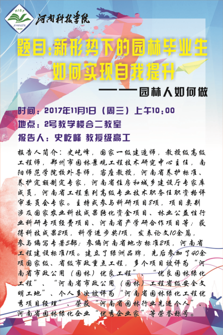 报告人简介:史屹峰,国家一级建造师,教授级高级工程师,郑州市园林景观工程技术研究中心主任,南阳师范学院校外导师,客座教授,河南省养护标准、养护定额制定专家,河南省住房和城乡建设厅专家库成员,河南省工程系列高级专业技术职务任职资格评审委员会专家。主持或参与科研项目8项,项目类别涉及国家农业科技成果转化资金项目、林业公益性行业科研专项经费项目、河南省产学研合作项目等;获得科技成果2项,科学进步奖1项,发表论文10余篇,参与编写专著5部;参编河南省地方标准2项,河南省工程建设标准1项。建立了绿洲品牌,先后参加了40余项国家级、省级市政重点工程,多个项目被评为“河南省市政公用(园林)优良工程”、“优良园林绿化工程”、 “河南省市政公用(园林)工程省级安全文明工地”、个人多次被评为“河南省园林绿化工程优秀项目经理”、 荣获“河南省园林行业先进个人”、 河南省园林绿化企业“优秀企业家”等荣誉称号。