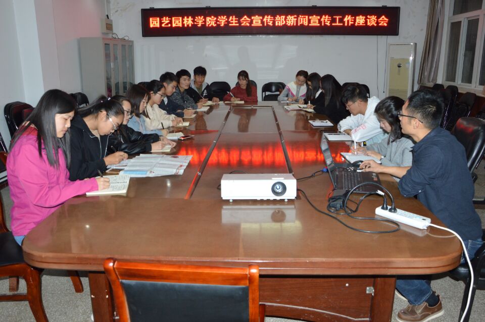 在院三楼会议室组织学生会新闻宣传工作座谈,分管新闻宣传工作的辅导员胡泉灏、学生会宣传部全体成员参加座谈。