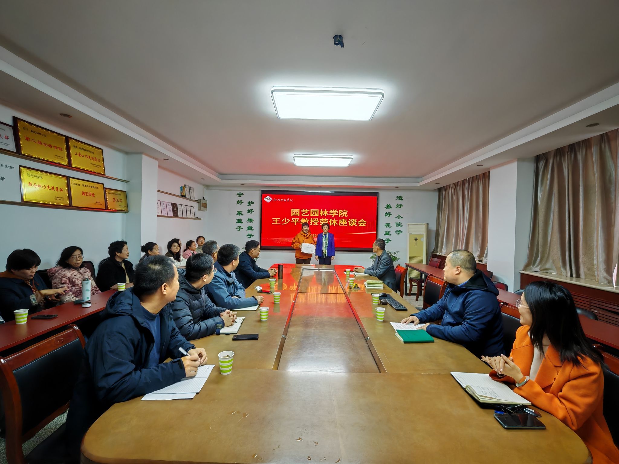 王莉华书记代表学校党委向王少平教授表达了最诚挚的祝福和最崇高的敬意,高度评价王少平教授是“百农精神”的忠实践行者、“志气林”故事的生动书写者。她强调,王教授用40年坚守诠释了“把论文写在祖国大地上”的崇高追求,希望她常回“家”看看,在青年教师培养、学科建设咨询等方面继续发挥“银发智慧”,让“严谨治学、甘为人梯”的火种在新时代绽放更璀璨的光芒。