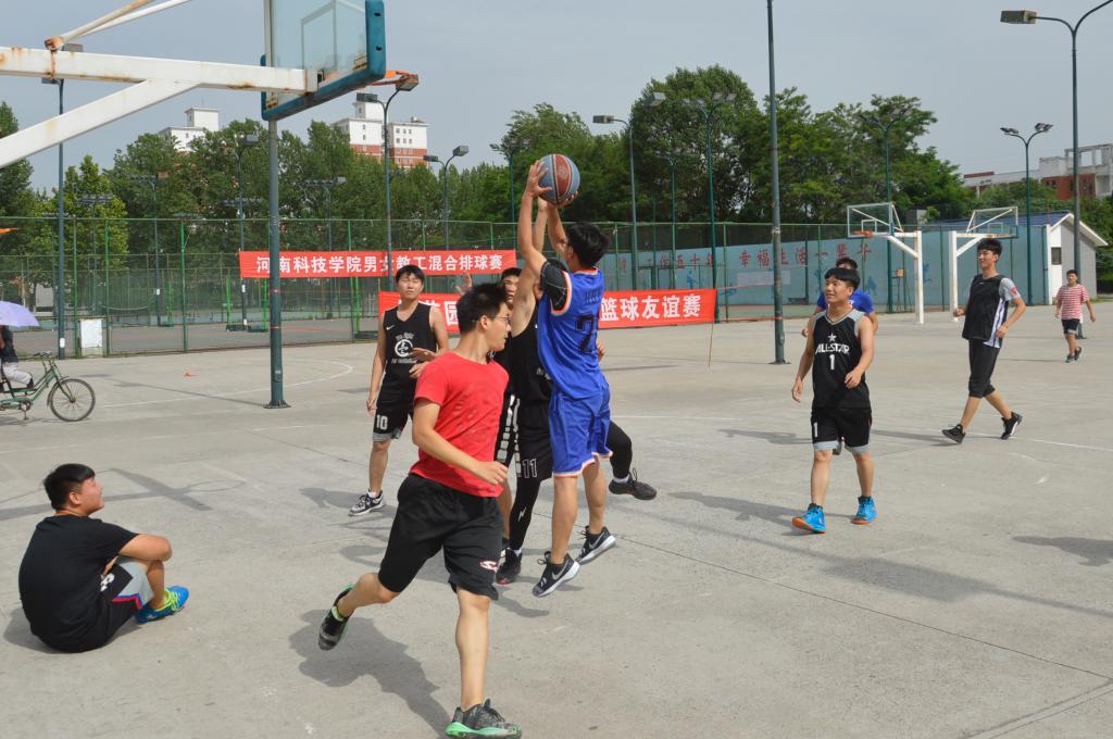 篮球场上,两队球员用心跑位、默契配合,积极拼抢,投篮精准,比分交错上升,气氛紧张热烈,赢得了场外的一阵阵喝彩。最终,经过一个多小时的角逐,比赛在欢笑中落下帷幕。