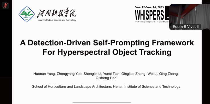 比赛中,我校景观生态功能与调控团队创新性地提出了“检测驱动的自提示高光谱目标跟踪框架”,有效应对了复杂场景下目标跟踪的技术难点。赛后,团队成员杨浩楠同学受邀,以《A Detection-Driven Self-Prompting Framework For Hyperspectral Object Tracking》为题,在大会上作了精彩报告,向国际同行展示了我校在高光谱目标跟踪领域的研究成果,彰显了该方法的创新性与学术价值。
