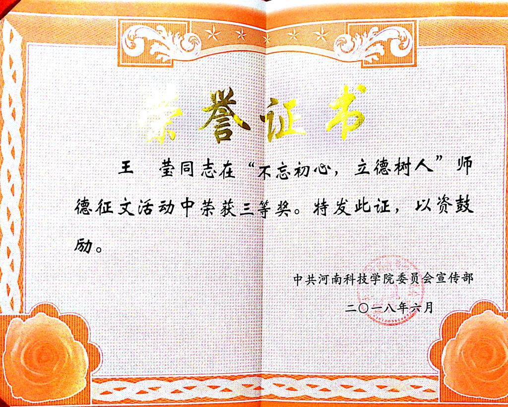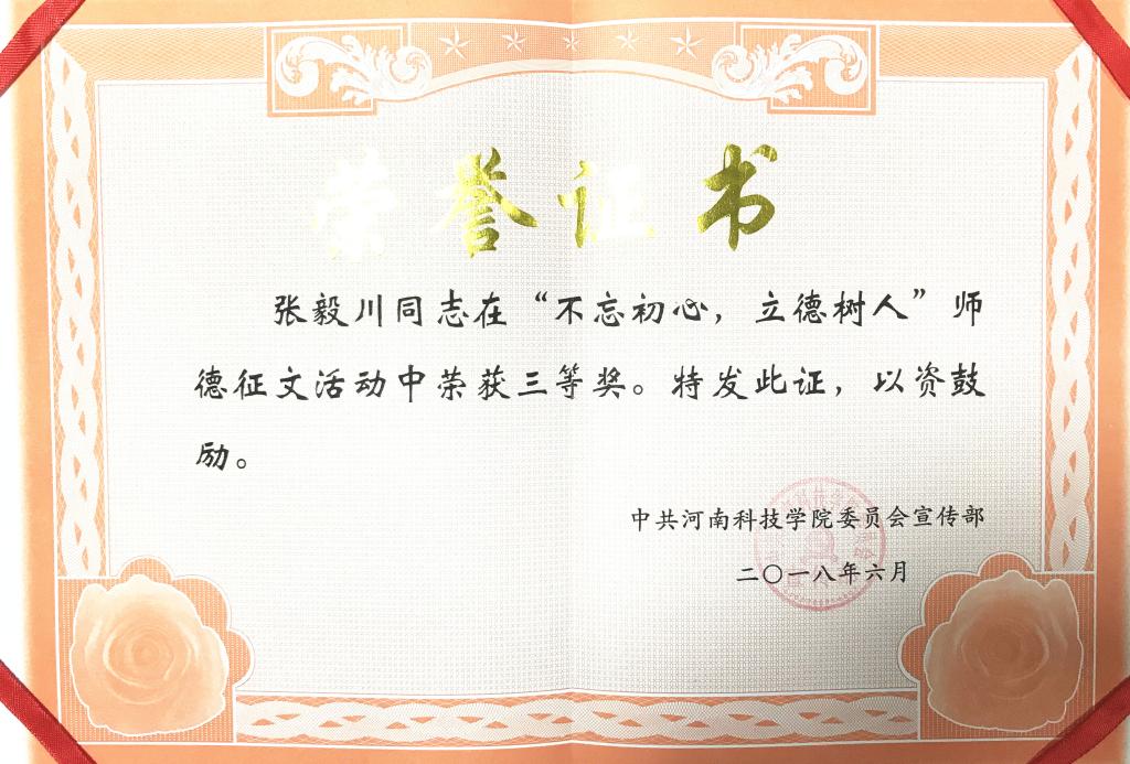我院张毅川老师、王莹老师在河南科技学院”不忘初心,立德树人”师德征文活动中荣获三等奖。