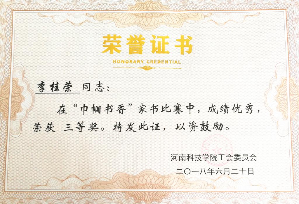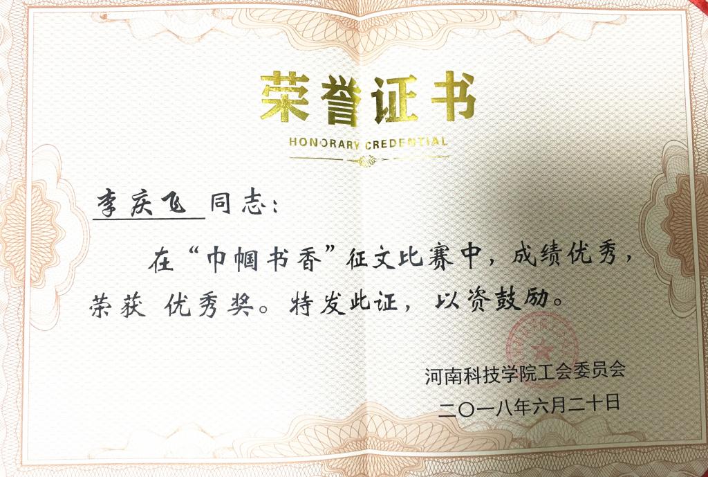 庆祝我院李桂荣老师、李庆飞老师在河南科技学院“巾帼书香”征文比赛中分别获得三等奖、优秀奖。
