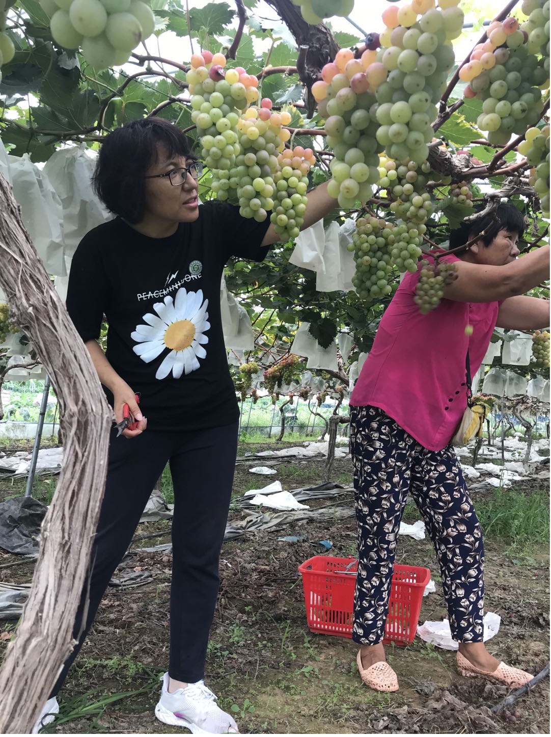 在绿苑果园,与园区负责人就果园炭疽病防控、“阳光玫瑰”果穗管理、果园排涝等技术以及后期果园管理注意事项进行了深入交流。