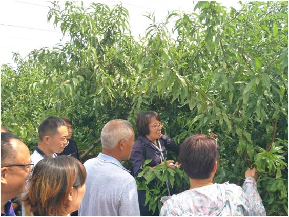 在平店乡曾庄村,周瑞金开展了桃树秋季管理技术专题培训,并就果农存在的果园郁闭、裂果和落果严重、病虫害防控难等问题进行了答疑讲解。之后,针对桃树秋季修剪关键技术对接受培训的果农进行了现场示范操作。