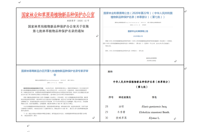 2020年8月28日,国家林草局科技中心(国家林草局新品办)在北京组织召开第七批林草植物新品种保护名录专家评审会。来自北京林业大学、山东农业大学、中国林科院、中国农科院草原研究所、中南林业科技大学、中国医学科学院药用植物研究所等单位的9名专家组成评审专家组。根据《植物新品种保护条例》及其《实施细则(林业部分)》有关规定,从2020年6月初发出正式征集通知到6月30日,共收到的328份推荐表,其中的243个属(种)为有效推荐,提交评审会。经专家评审,筛选出其中的78个属(种),列入第七批林草植物新品种保护名录,并于2020年12月8日发布。我院推荐的芳香植物木香薷位列29名。详见下图: