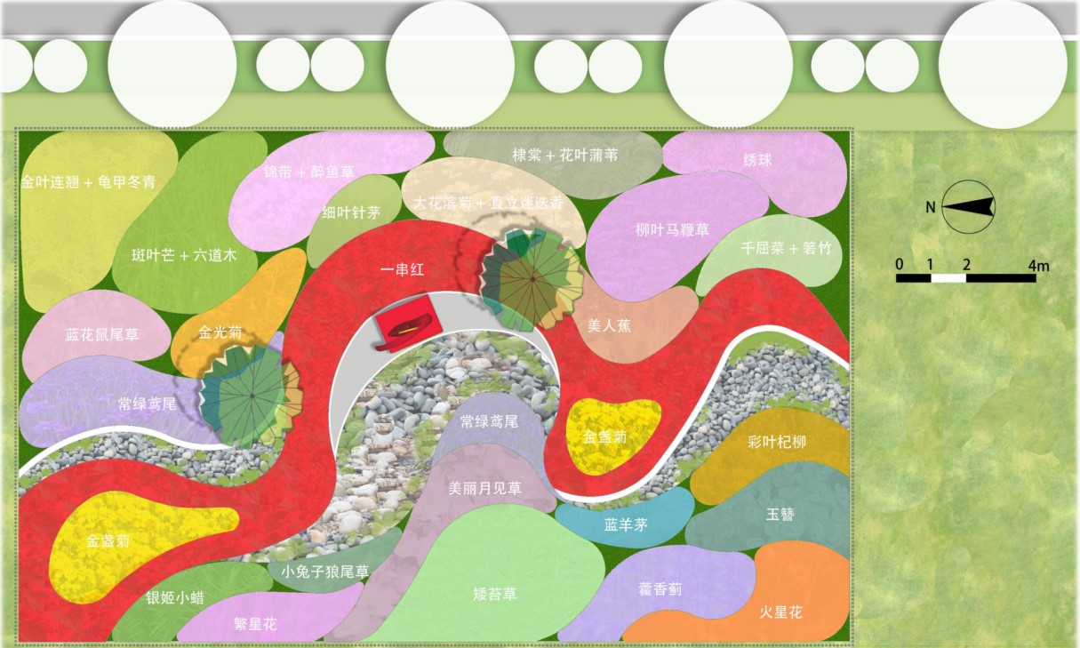 该作品结合党的百年历史文化,从中国共产党诞生地嘉兴南湖着手,提炼南湖要素,以“红飘带”为方案表现形式,以“迎百年华诞,展生态花韵”为项目主题,用中原的自然多彩之美向党的百年华诞献礼。