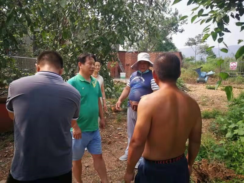服务团成员首先来到位于正面村的卫辉市德旺农业发展有限公司的果园,实地查看果园的受损情况。该公司流转当地农民土地300多亩,主要经营果树种植、农产品初加工及果蔬的销售及采摘等业务。此次洪灾导致河流河床改道、果园土壤严重流失,正值采收期的桃、葡萄等果树倒伏及冲毁受损,果园直接经济损失达到一千万元以上。团队成员来到果园,仔细查看树体生长情况,针对河床改道及土壤损失严重的现状,提出了清淤泥排水、扶正培土、松土晾根、及时对果园喷施杀菌剂进行消毒等技术措施。服务团队成员还与该公司主要技术人员和果农进行了座谈,为果农排除果园积水,恢复树势,降低损失积极出谋划策。专家服务团成员还针对受灾后的果树抵抗力下降,加之高温高湿的天气特点,极易诱发病菌,预防炭疽病、疫腐病等对小福岭农场的果园防疫提出了具体的防控措施。