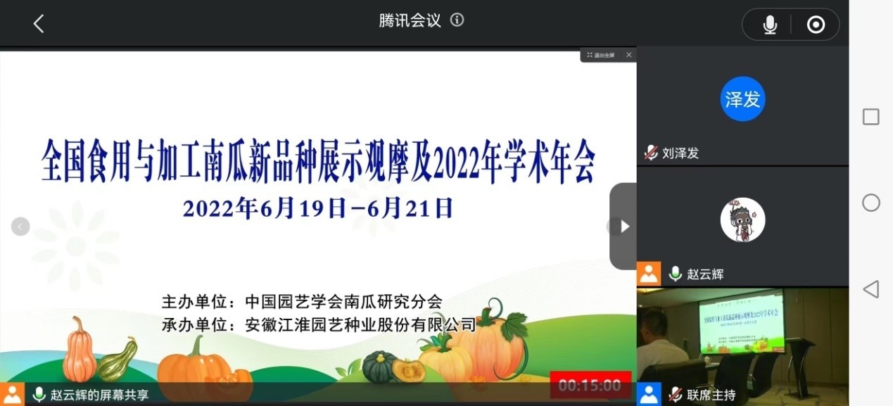 6月20日在安徽省合肥市举行“全国食用与加工南瓜新品种展示观摩会及2022年南瓜学术年会”。会议由中国园艺学会南瓜研究分会主办,安徽江淮园艺种业股份有限公司承办,会议采取线上线下混合模式进行。20日上午进行学术交流会,下午以抖音直播的形成进行了“全国食用与加工南瓜新品种展示观摩会”。我院南瓜研究团队所有教师和硕士研究生以线上方式参加了本次会议,向大会提交了5篇南瓜学术论文。学术交流会上,南瓜研究分会常务理事李新峥教授及团队成员陈碧华教授、郭卫丽副教授、李庆飞博士分别做了河南省发展南瓜产业的优势与思考、南瓜耐镉砧木的选育及在黄瓜上的应用、浅谈中国南瓜抗白粉病的生理和分子机制、南瓜AP2/ERFs家族基因的鉴定及对乙烯的响应学术报告;下午新品种观摩会上展示了我院南瓜研究团队培育的百蜜系列南瓜新品种。