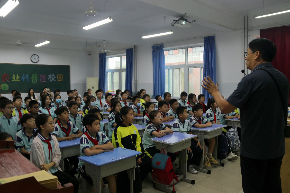李新峥教授在校后勤服务中心副主任张建设、子弟学校校长郭斐杰等陪同下,来到子弟小学为六年级(二)班70多名学生们开展农业科普活动,进一步增强青少年对农业知识的储备,启迪同学们的农业思维与兴趣,为未来培育农业人才播下“种子”。