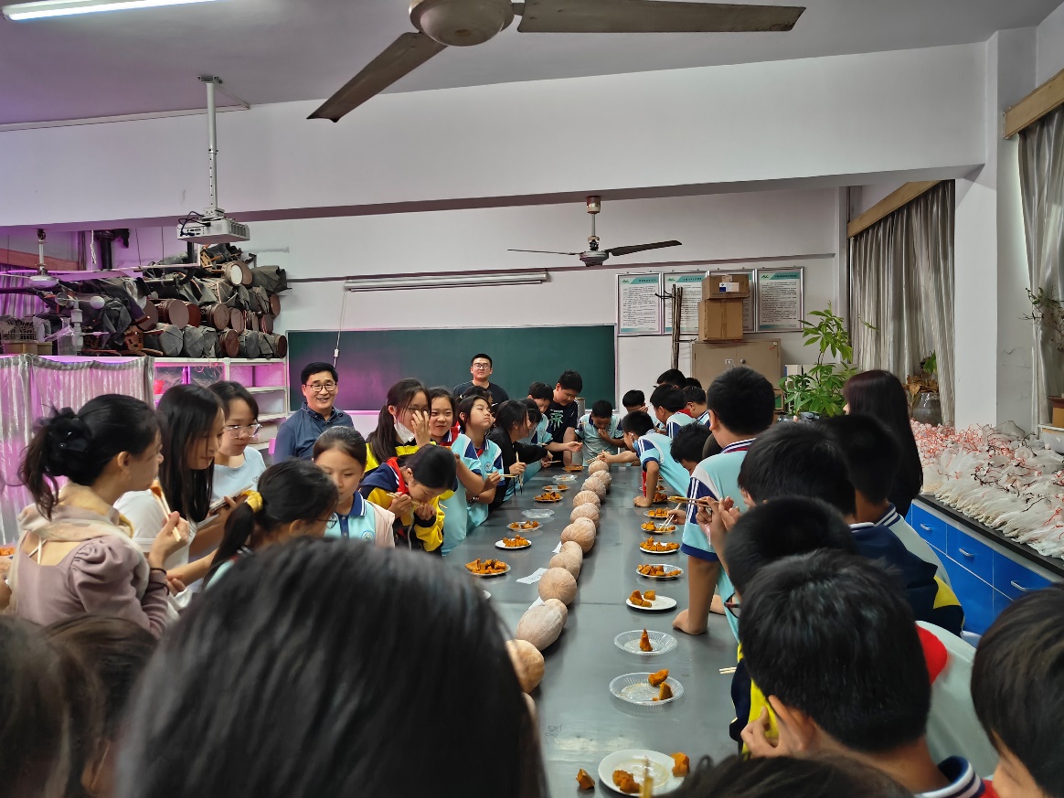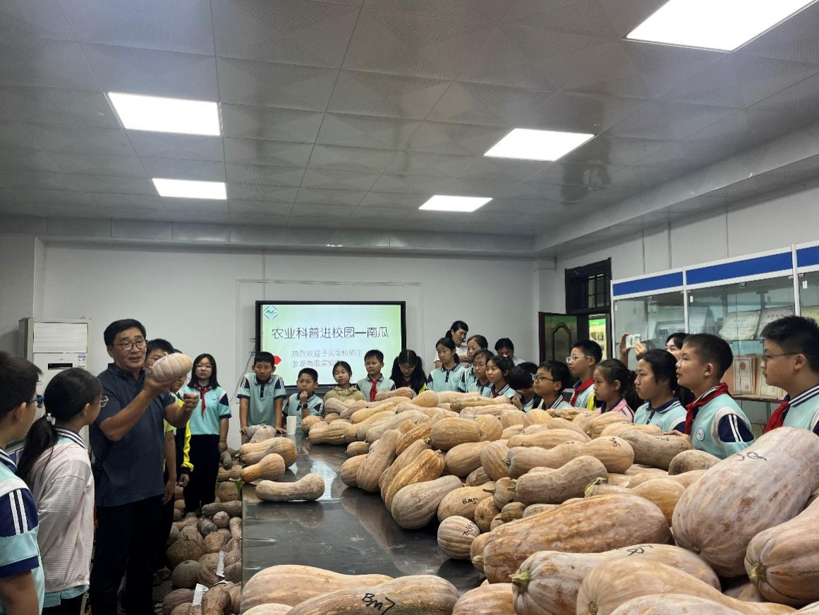李教授走进课堂,通过生动的语言和精美的PPT,图文并茂地向学生们讲解南瓜用途、南瓜特性、南瓜种植等农业知识。李教授授课风格幽默风趣,深入浅出的讲解和幽默生动的语言赢得了学生们阵阵掌声,在一片欢笑声中了解到更多南瓜知识。接下来,李教授带领同学们走进南瓜研究实验室,直观地观察了形形色色南瓜的果实,并通过现场品尝百蜜系列13个南瓜品种的环节,让同学们亲身感受到南瓜的“甜蜜”。科普活动结束后,李新峥教授与全体师生合影留念,记录下这美好又难忘的时刻。