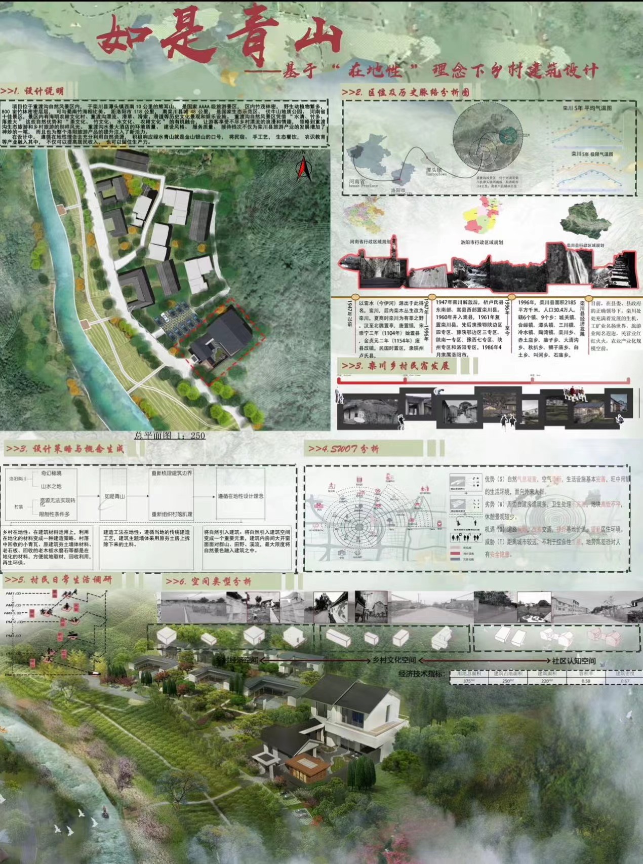 本次大赛分为四类赛项内容:乡村规划设计、乡村建筑设计、乡村景观设计和乡村创意设计,共收到有效作品31份,经过评委会对参赛作品的审核和评分,《红绿共生.区域共荣—基于红色文旅产业视角下的村庄规划》等3份作品获得一等奖,《栖间小筑—基于乡村振兴下的民宿景观设计》等6份作品获得二等奖,《此间记忆—基于文旅视角下的延津县老庄村村庄改造》等9份作品获得三等奖。学院从中选出14份优秀作品代表我校参加河南省评审。