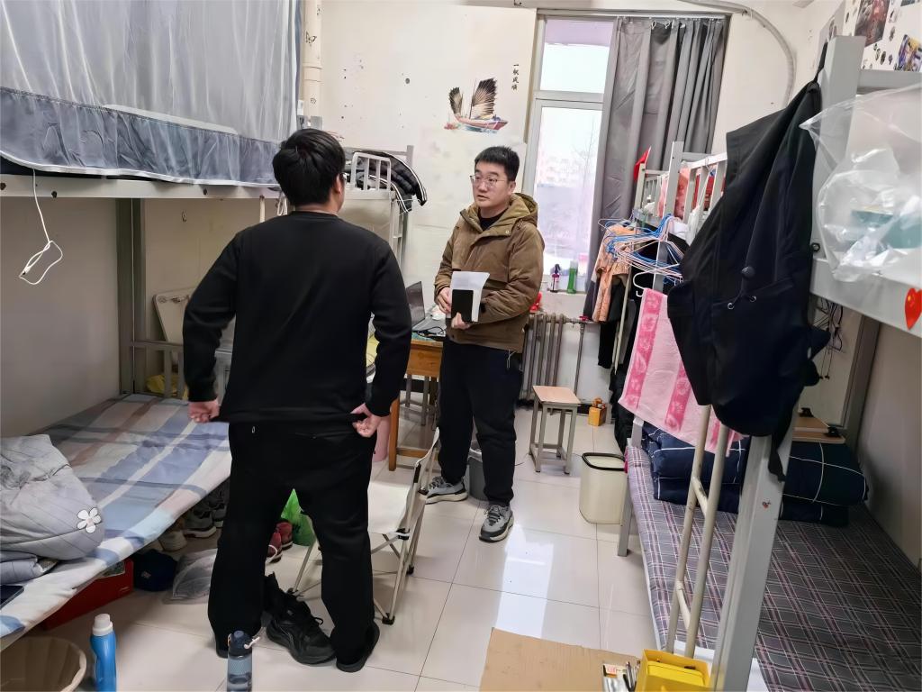 党委书记郭超杰,党委副书记王占魁,团委书记刘璐、正科级辅导员曹云,团委副书记王伟瑜及辅导员黄金旭分头对寒假宿舍安全隐患进行全面排查。