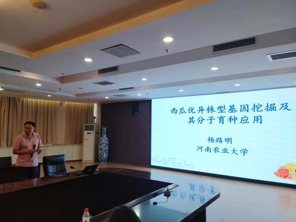杨路明教授以“西瓜优异株型基因挖掘及其分子育种应用”为题进行了学术汇报。杨教授首先分析了中国西瓜产业发展、栽培模式、西瓜株型相关农艺性状的研究现状。随后根据生产上存在西瓜整枝打杈耗时耗力的问题,分析了我国蔬菜生产主要成本与净利润的变化。最后,杨教授围绕优异基因挖掘与轻简化栽培,介绍了西瓜少侧枝基因Clbl的精细定位与利用、西瓜短蔓基因Cldw1的精细定位与利用、利用西瓜液相芯片技术精准定向改良西瓜优异自交系等研究成果。