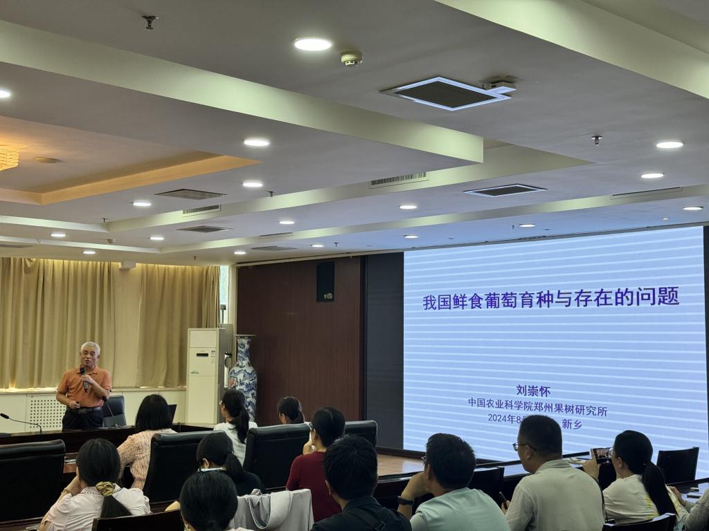 刘崇怀研究员以“我国鲜食葡萄育种与存在的问题”为题进行了学术汇报。刘研究员在报告中首先详细介绍了我国鲜食葡萄育种领域的发展情况。接下来,刘研究员指出,近年来我国的商业育种开始变得越来越活跃,企业和科研机构的合作也逐渐增多,育成的葡萄新品种数量不断增加,这些新品种在品质、抗病性、产量等方面都有了显著提升。这一系列进展标志着我国在鲜食葡萄育种领域已迈入了新的发展阶段,为满足国内外市场对优质葡萄的需求提供了有力保障。然而,刘研究员也在报告中指出了当前我国鲜食葡萄产业面临的一些突出问题。他特别强调,目前我国葡萄主栽品种的本土化程度较低,许多种植的主要品种依赖于进口,这不仅制约了我国葡萄产业的进一步发展,也影响了品种的适应性和产业的可持续性发展。刘研究员认为,未来需要更加注重本土化品种的选育和推广,提升我国葡萄产业的自主创新能力。