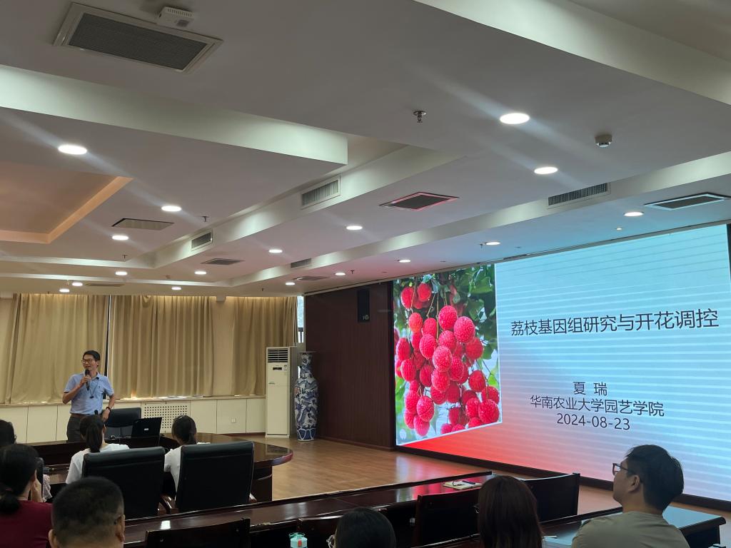 夏瑞教授以“荔枝基因组研究与开花调控”为题进行了学术汇报。夏教授介绍了无患子科荔枝的起源、进化和发展,分享了解析破译高杂合木本果树荔枝基因组——揭示群体独立驯化和杂种优势的心路历程。借助高质量基因组数据库揭示荔枝开花调控机制,基于基因组缺失序列开发可用于荔枝辅助育种的分子标记。夏教授课题组开发的一系列生物信息学数据分析工具TBtools、sRNAminer和IGV-GSAman已经被国内外科研工作者所使用十余万次。