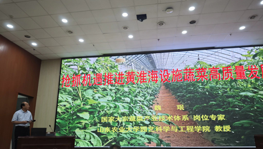 魏珉教授以“抢抓机遇推进黄淮海设施蔬菜高质量发展”为题进行了学术汇报。魏教授首先向大家介绍了黄淮海地区设施蔬菜在发展过程中存在的诸多问题和挑战,如设施标准化水平低、装备不配套、人工管理作业强度大、栽培技术粗放等,同时结合“二十大”报告、“1号文件”等产业政策,提出该行业领域面临的几大重点任务和重大工程。随后就其团队在黄淮海地区优型棚室结构的创新与推广、茄果类蔬菜高光效功能棚膜的创制与应用、设施主要果菜宽行高畦种植模式的创建、以生物质资源利用为核心的土壤质量保持技术的构建等方面的研究现状做了详细介绍,为推进黄淮海设施蔬菜高质量发展提供了研究方向和技术指导。