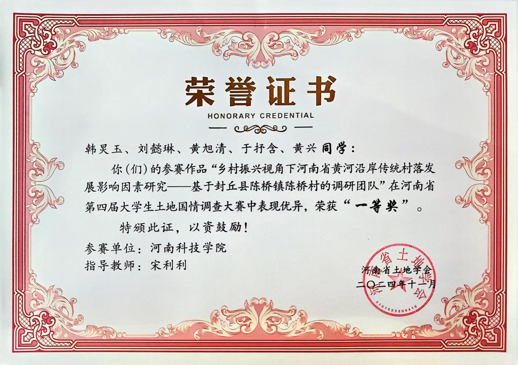 近日,由河南省自然资源厅指导,河南省土地学会主办,河南农业大学承办的河南省第四届大学生土地国情调查大赛在郑州河南农业大学举行,来自全省18所院校的74份作品参加决赛。由我院宋利利老师指导的城乡规划专业本科学生(韩炅玉,刘懿琳,黄旭清,于抒含,黄兴)组成的队伍团结协作,表现出色,其作品《乡村振兴视角下河南省黄河沿岸传统村落发展影响因素研究—基于封丘县陈桥镇陈桥村的调研》作品荣获一等奖,宋利利老师荣获优秀指导老师奖。