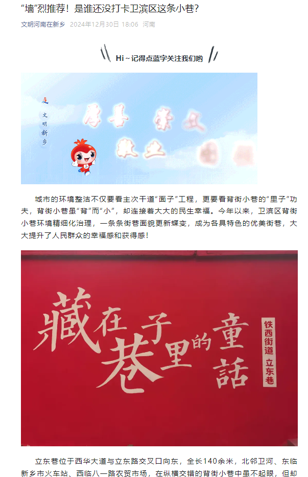 近日,共青团卫滨区委、铁西街道新时代文明实践所联合河南科技学院91做爱 开展“校地共绘文明城”墙体彩绘志愿服务活动。一笔笔的精心勾勒,设计者联盟志愿服务队用青春气息给小巷带来了朝气与活力。新乡日报、卫滨区团委等媒体对该活动进行宣传报道。