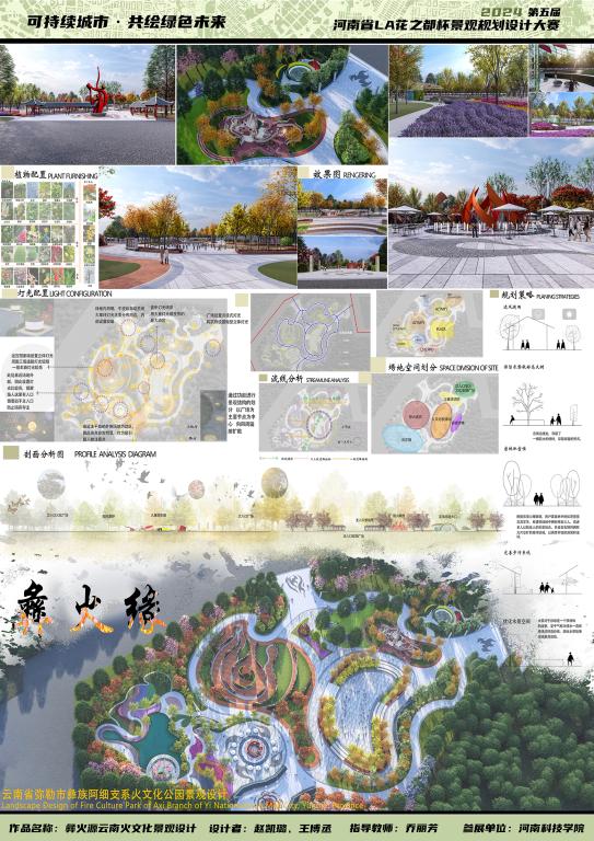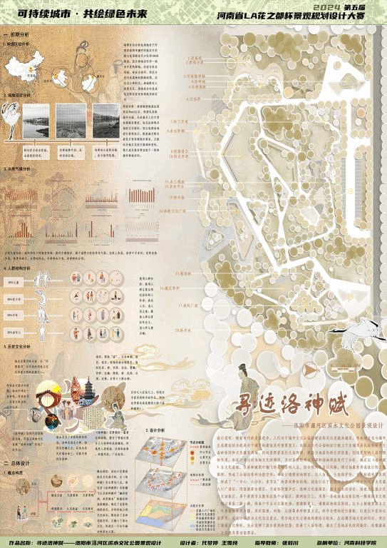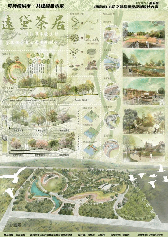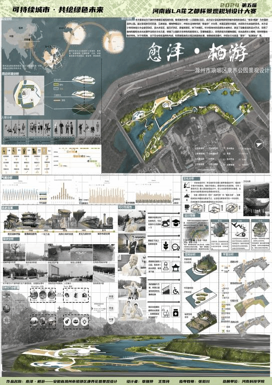 学子凭借卓越的创意和扎实的专业能力,在本次竞赛中斩获多个奖项。参赛队伍由研究生与本科生联合组成,其中风景园林硕士研究生王雪纯、王博丞,本科生章雅婷、褚思源、代梦婷、刘石磊、赵凯璐等提交了作品。获奖作品包括:《愈泽·栖游——滁州市琅琊区康养公园景观设计》荣获特等奖、《远黛茶居——信阳市车云山村茶文化主题公园景观设计》荣获一等奖;《寻迹洛神赋——洛阳市瀍河区滨水文化公园景观设计》、《石“粮”皓月——许昌市曹魏运粮河文化滨水公园景观设计》、《彝⽕缘——云南省弥勒市彝族阿细支系火文化公园景观设计》、《千桐树——兰考乡村文化公园景观设计》荣获二等奖。获奖作品围绕康养休闲、地域文化、历史文化、民族文化、乡村文化等主题展开创新设计,充分展现了学生们对景观规划设计的深入理解,也体现了学院在景观文化传承与创新方面的培养成果。