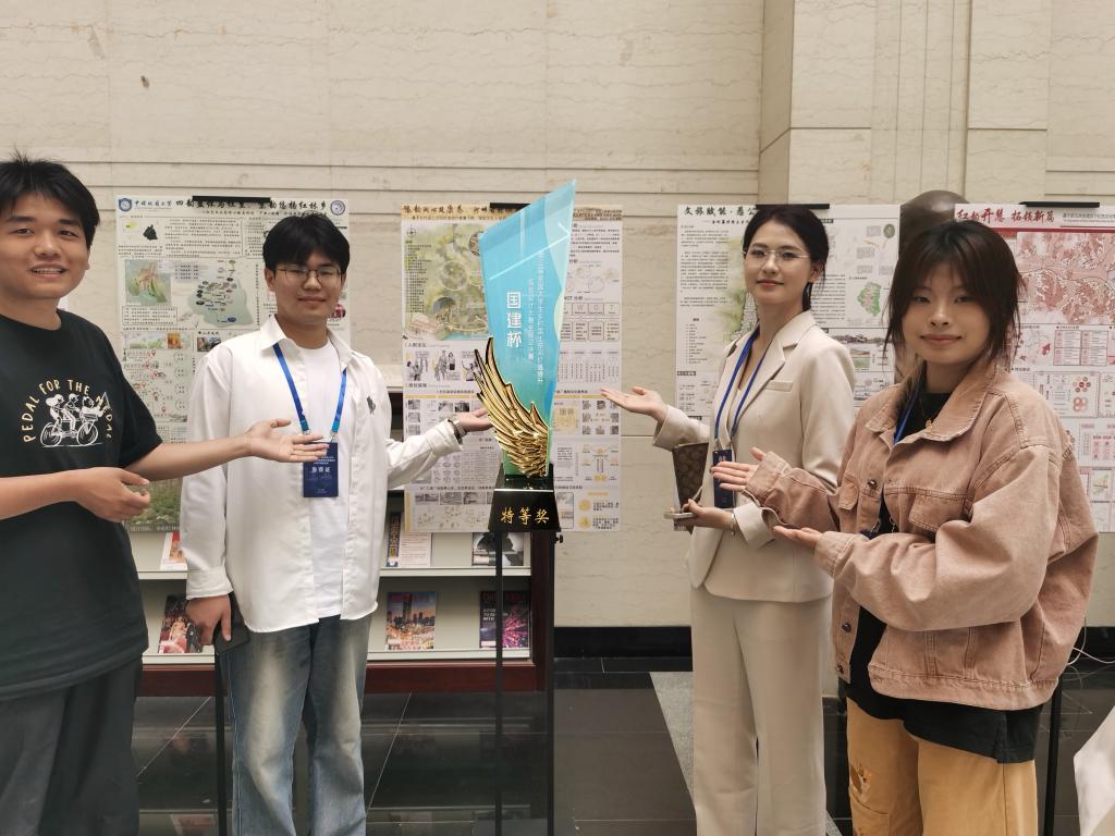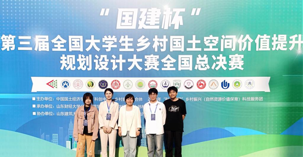 5月9日-10日,由中国国土经济学会、“科创中国”乡村振兴联合体、2024年度“科创中国”乡村振兴(自然资源价值保育)科技服务团主办,山东财经大学承办的2025“国建杯”第三届全国大学生乡村国土空间价值提升规划设计大赛全国总决赛于在山东济南举办。我院城乡规划和风景园林专业本科生仉建涛、李赜菥、刘蓝天和周欣辰组成的代表队参赛作品《豫韵润心筑康养,河畔古村焕新生—巩义市南河渡村国土空间价值提升研究报告》在全国总决赛中荣获特等奖,宋利利老师荣获优秀指导老师。