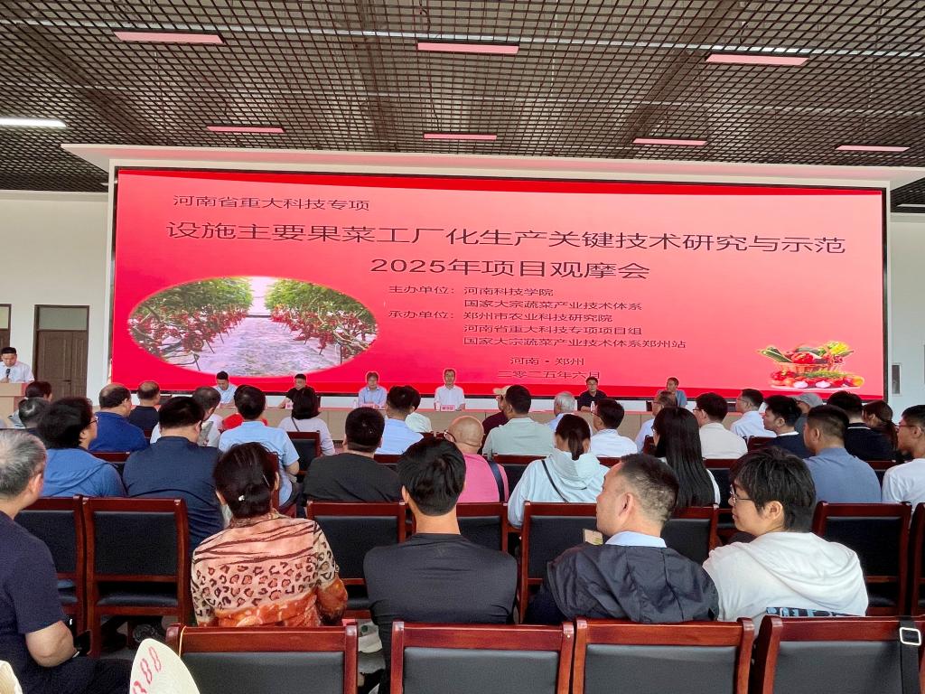 6月5日上午,我校主持的河南省重大科技专项“设施主要果菜工厂化生产关键技术研究与示范“观摩会在郑州市农业科技研究院蔬菜科技示范基地举行,会议由我校和国家大宗蔬菜产业技术体系联合举办。河南省科技厅党组成员、副厅长何守法,校长阚云超,副校长丁轲,科技处负责人,国家现代农业产业技术体系岗位专家和综合试验站站长、省重大专项项目组成员和设施蔬菜生产企业界代表100余人参加了会议。