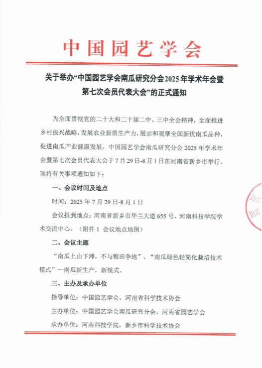 关于举办“中国园艺学会南瓜研究分会2025年学术年会暨第七次会员代表大会”的正式通知
