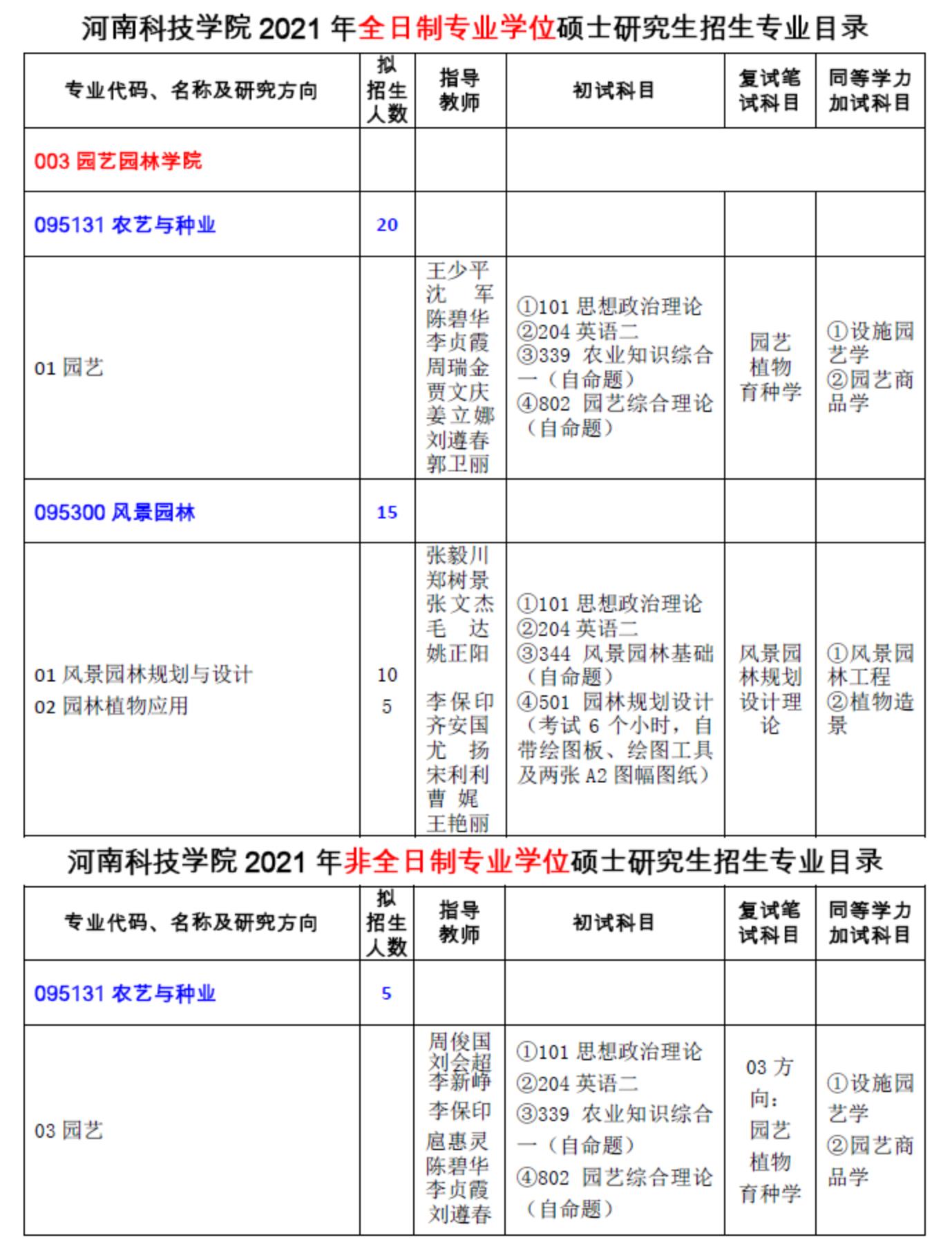 园艺学为河南省特色骨干学科群,第八批省级重点一级学科,2007年开始招收硕士研究生,校博士点建设学科,2011年被国务院学位委员会确定为一级学科硕士学位授权点,招收园艺学学术型硕士研究生和农艺与种业(园艺)专业硕士研究生。风景园林学为第九批省级重点一级学科,2018年获批增设风景园林学一级学科硕士授权点与风景园林专业硕士授权点,并于2019年开始招生。学院现有学术型硕士导师26人,专业学位硕士导师32人。