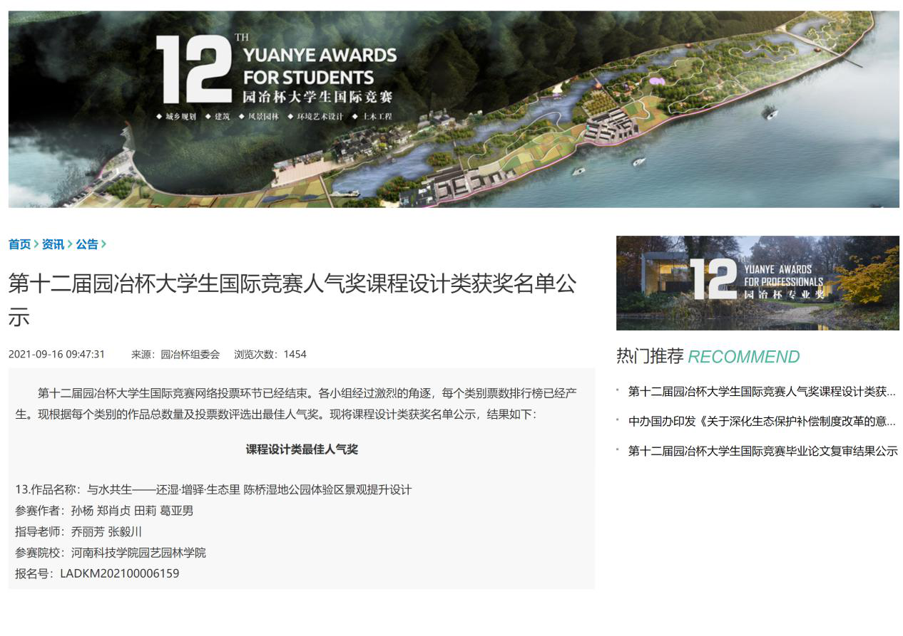 9月16日,第十二届园冶杯大学生国际竞赛组委会公布了“园冶杯大学生国际竞赛课程设计最佳人气奖”获奖名单。经评审委员会的认真评选和严格审定,由河南科技学院91做爱