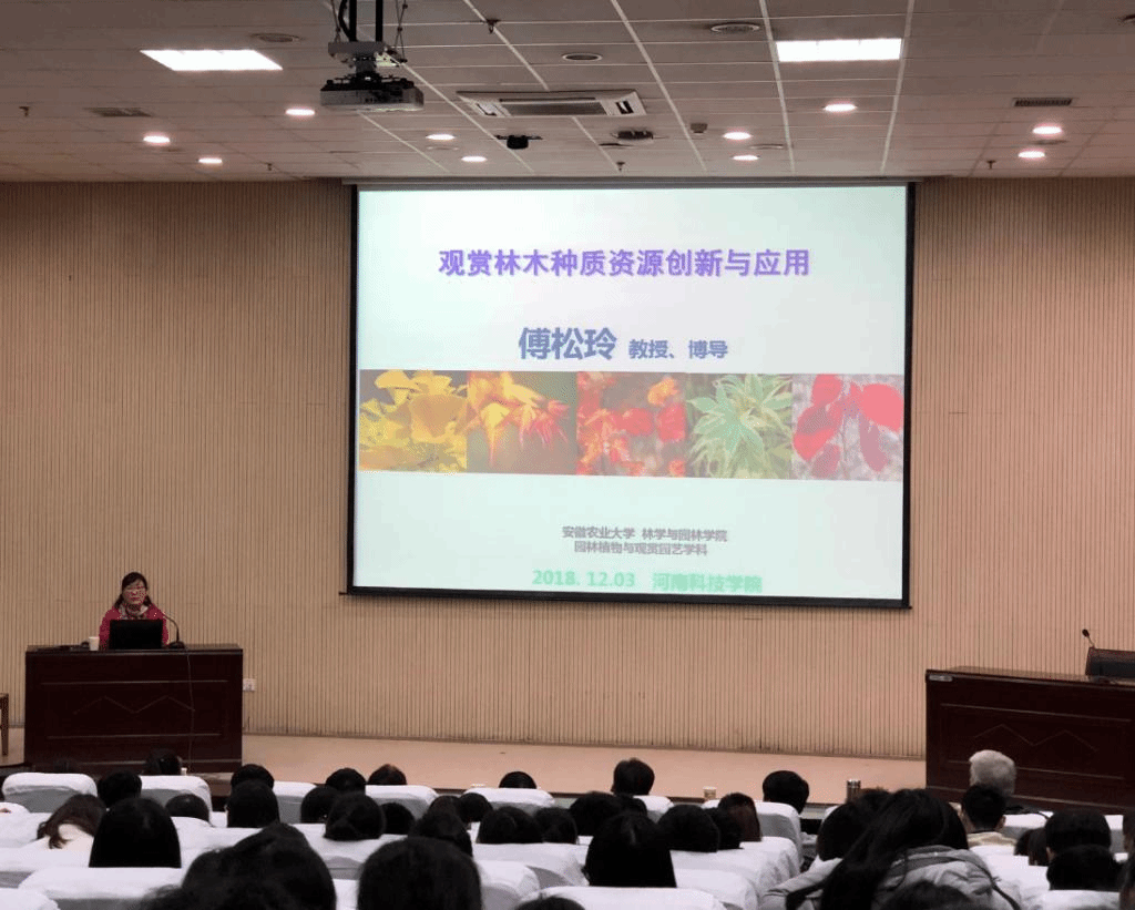 邀请安徽农业大学教授、博士生导师傅松玲来院进行学术交流,在新图书馆一楼报告厅做了题为“观赏林木种质资源创新与利用”的学术报告。园林相关专业师生约300人参加了报告会,报告会由科研副院长张毅川主持。