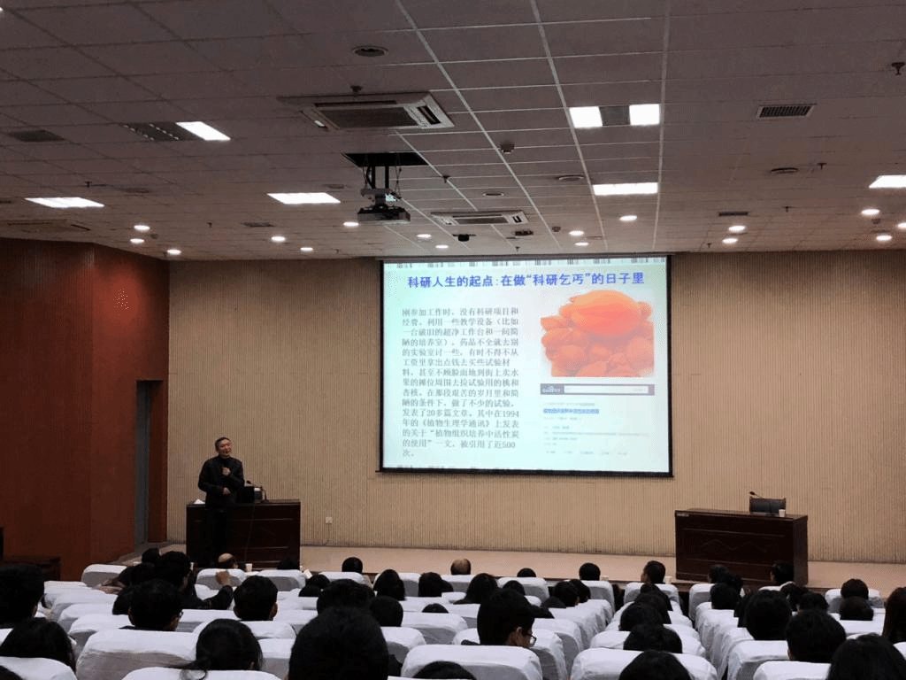刘用生教授从最近发表在《nature》子刊的一篇论文说起,谈了钱学森先生关于“植物嫁接改造学”一封信对他个人的启发,探讨了植物嫁接杂交问题以及为什么会对达尔文遗传理论感兴趣。他总结了达尔文遗传理论的要点及其所解释的现象,并通过大量的文献阅读为达尔文的遗传理论寻求的新证据。他还和师生分享了SCI投稿的感怀,并借用刘禹锡的一首《秋词》谈了科学创新。最后,他用爱因斯坦的一句话“It’s not that I’m so smart, it’s just that I stay with problems longer”作为结束语,鼓励在座师生在科学的道路上要坚持不懈地探索。报告结束后,与会师生针对达尔文遗传理论和嫁接杂交问题同刘教授进行了互动交流。该报告拓宽了师生的视野,使师生对达尔文遗传理论产生了浓厚的兴趣,增强了师生解决科学问题的信念。