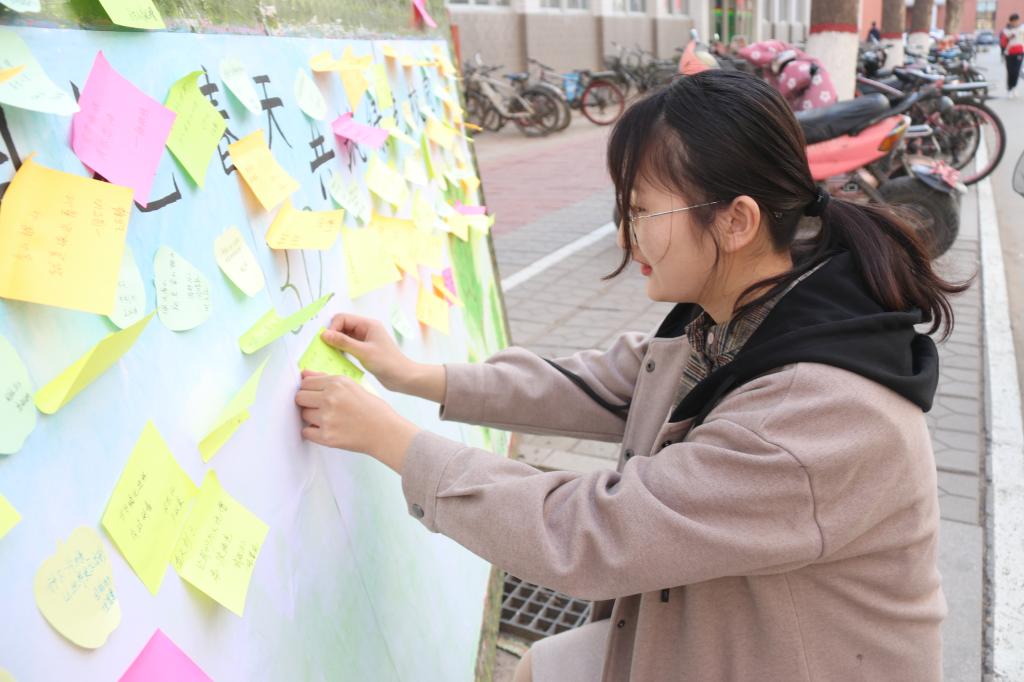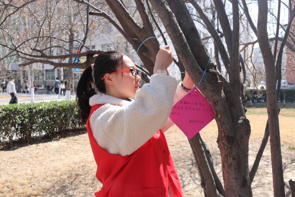 活动伊始,学生们身穿红色志愿服装,首先来到教学楼附近,为部分树木挂牌、浇水,让更多的同学们了解绿植,了解树木,爱护校园。同时,在一、二号教学楼的楼宇间,同学们用平时的课堂所学的专业课程知识和实践实习经验,为更多的同学们普及盆栽养植及养护,他们专心和耐心的讲解和介绍,引得众多师生们的驻足听倾听。与此同时,一旁“播下一粒种·植出万抹绿”的活动也在如火如荼地进行,同学们手里拿着希望的种子,纷纷在展板上留下了绿色寄语,表达了对绿色环境的向往和美化校园的心声。