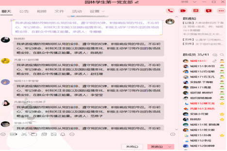 最后,支部书记王莹老师向全体支部成员提出了三点要求:1、服从学校要求,做到不提前返校,在家中合理安排自己的学习任务和时间;2、发挥党员先锋模范作用,积极响应组织号召,参与志愿者活动;3、在抗击疫情的攻坚时刻不可精神松懈,在群众中传播正能量。