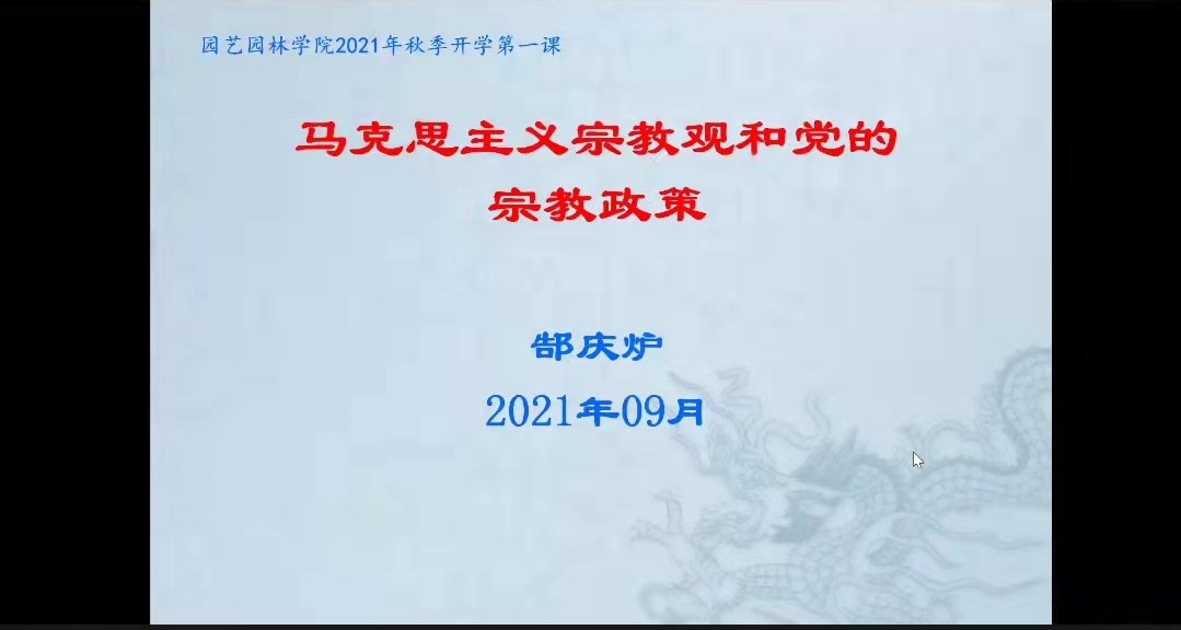为增强新生马克思主义宗教观,学习党的宗教政策,9月14日下午,91做爱 郜庆炉以“马克思主义宗教观和党的宗教政策”为题,通过网络平台为2021级新生讲授了开学第一课。