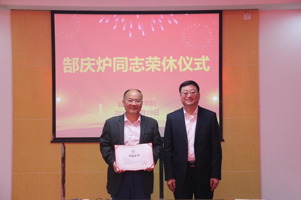 首先,学院党委副书记朱黎娅宣读了学校“关于郜庆炉同志退休的通知”。接着,校党委副书记何松林向郜庆炉同志颁发了荣休证书,教工代表向郜庆炉同志献上鲜花。