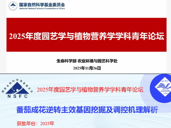 11月26日,我院青年教师孙要光博士应邀参加国家自然科学基金委员会生命科学部农业环境与园艺科学处召开的2025年度园艺学与植物营养学学科青年论坛线上会议,并作题为《番茄成花逆转主效基因挖掘及调控机理解析》的学术报告。