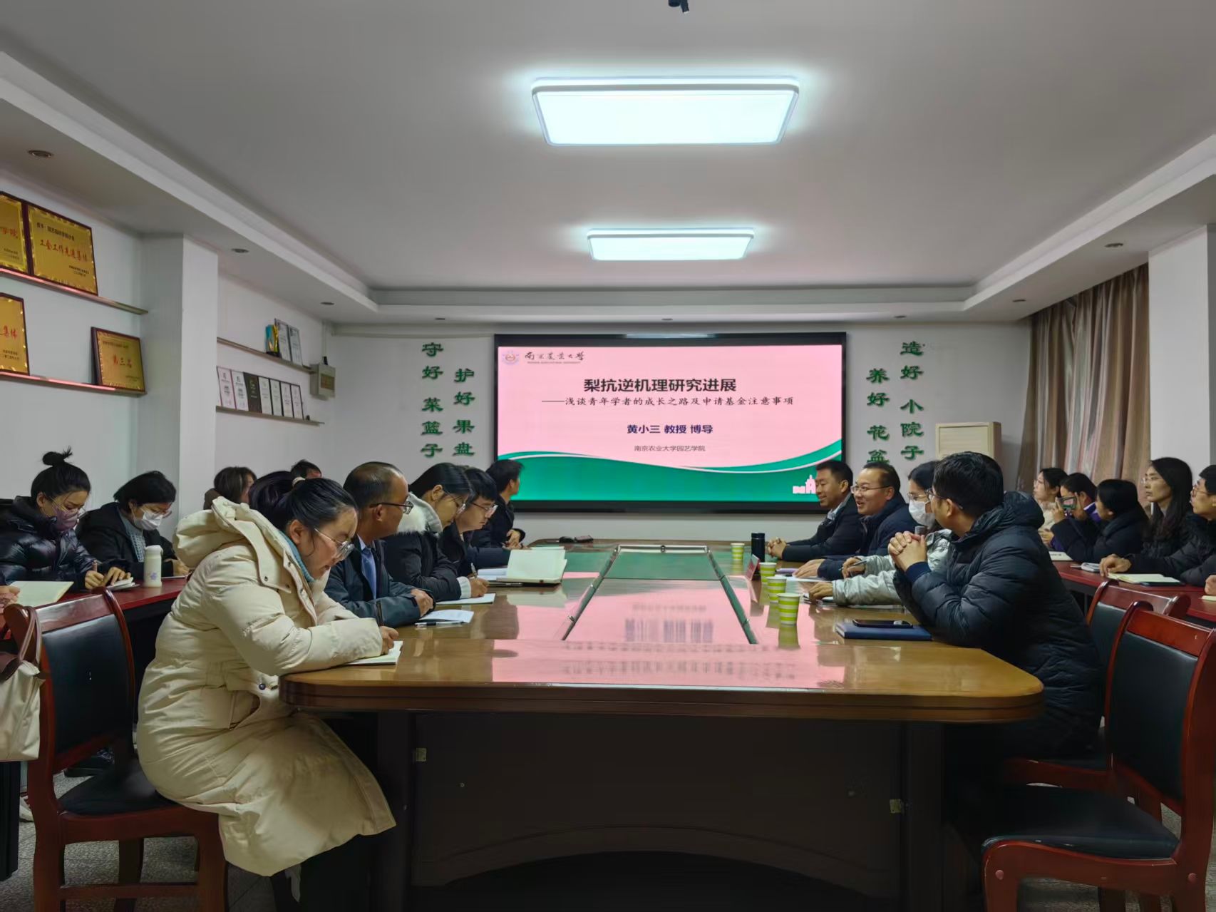 黄教授以“梨抗逆机理研究进展——浅谈青年学者的成长之路及申请基金注意事项”为题,结合自身科研经历,从学术职业生涯发展的不同阶段入手,系统阐述了青年学者的成长路径与关键任务。在基金申报指导中,他强调应立足长期积累的研究方向,精准凝练科学问题,并围绕选题设计、立项依据撰写和研究方案构建等核心环节进行了重点讲解。同时,针对项目摘要撰写,提出“凝、集、推、解”四字要诀,强调突出项目亮点、理清问题链和逻辑链。报告内容紧扣实际、针对性强,与会教师普遍表示深受启发。