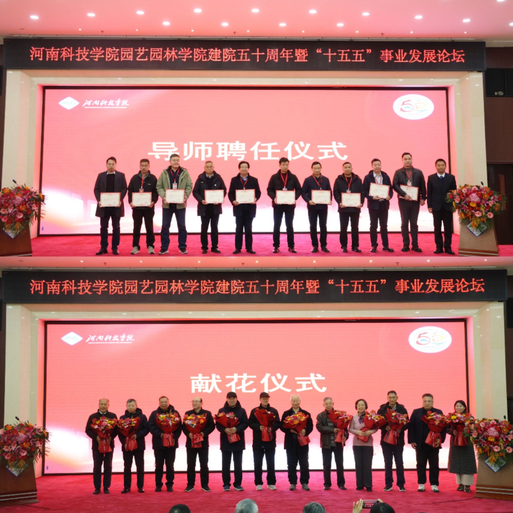 在行政楼308会议室举行建院五十周年暨“十五五”事业发展论坛。河南省原副省长武国定、河南省政协人口与资源环境委员会原主任王爱、中国农业发展银行宁夏回族自治区分行原行长翟渊博等校友代表,校党委书记宋亚伟,校纪委书记王莉华,兄弟院校代表,学院退休教师代表,曾在学院工作过的领导及教师代表共300余人齐聚一堂,共忆办学初心,共话发展蓝图。论坛由学院党委书记孙震寰主持。
